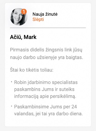 Jūsų įdarbinimo specialistas taip pat reguliariai su Jumis bendraus, teiks Jums rekomendacijas ir pagalbą.